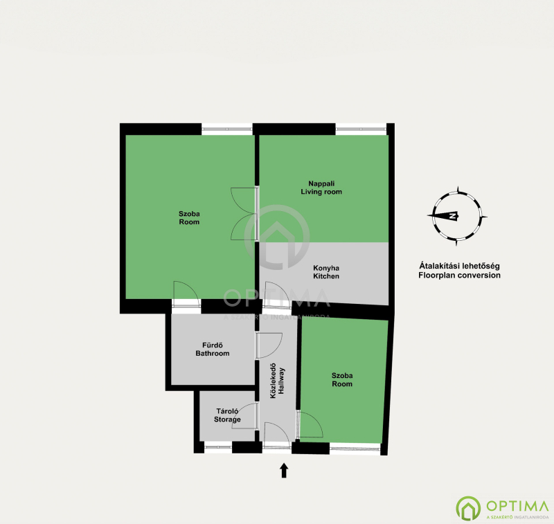 • Átalakítási lehetőség: amerikai konyhás nappali + két hálószoba kialakítása is megvalósítható, így saját célra és kiadásra is rugalmasan alakítható